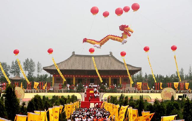 圖片說明:由海外華人捐資興建的中華三祖堂,位于軒轅湖以東,黃帝泉北200處,是中國(guó)黃帝城文化旅游區(qū)的中心景點(diǎn)。三祖堂是一座仿唐建筑,重檐飛角,恢弘壯闊,全部木質(zhì)結(jié)構(gòu)。全堂占地104畝,由平面祭壇、三祖堂、后殿組成。殿內(nèi)三位祖先的塑像姿態(tài)各異栩栩如生,居中的黃帝氣宇軒昂,右側(cè)的炎帝睿智儒雅,左側(cè)的蚩尤勇武彪悍,塑像高6全部由泥土塑成。大殿四壁繪有涿鹿之戰(zhàn)、阪泉之戰(zhàn)、合符釜山、定都涿鹿四大歷史事件的大型壁畫。