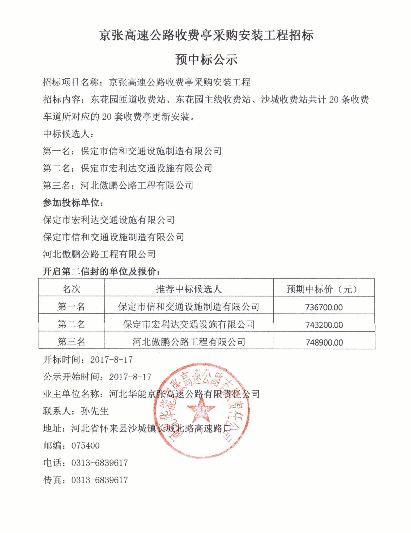 京張高速公路收費(fèi)亭采購(gòu)安裝工程招標(biāo)預(yù)中標(biāo)公示
